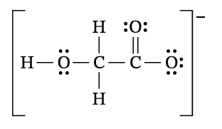In the glycolate ion \( C_2H_3O_3^- \), the negatively charged oxygen atom is the basic site that accepts a proton (\( H^+ \)) from water. On the Lewis diagram, one of the terminal oxygen atoms with a negative formal charge should be circled. Due to resonance, both terminal oxygen atoms are equivalent.