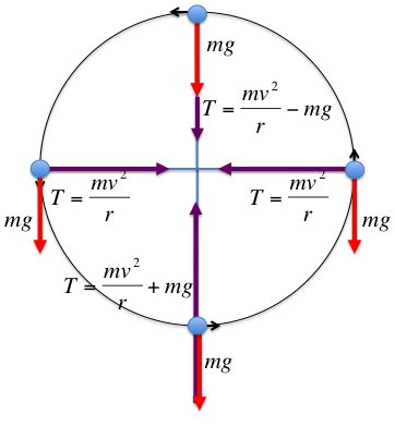 - At Bottom: \( T_{\text{bottom}} = \dfrac{m v^2}{r} + mg \)