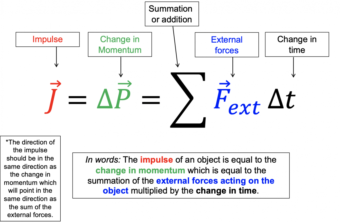 \( \vec{J} = \Delta \vec{p} \) → \( \vec{F}_\text{net} \Delta t = m \vec{v}_f – m \vec{v}_i \).