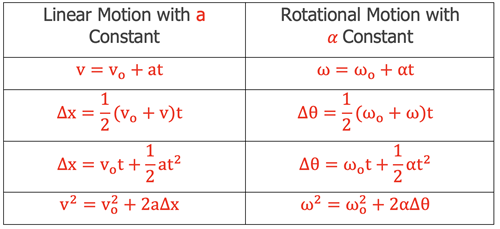 - Linear: \( s = v_0 t + \dfrac{1}{2} a t^2 \) ↔ Rotational: \( \theta = \omega_0 t + \dfrac{1}{2} \alpha t^2 \)