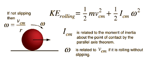 - Total kinetic energy of a rolling object: \( KE_\text{total} = \dfrac{1}{2} m v^2 + \dfrac{1}{2} I \omega^2 \)