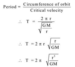 \( T = \dfrac{2 \pi r}{v} = \dfrac{2 \pi r}{\sqrt{\dfrac{G M}{r}}} = 2 \pi \sqrt{\dfrac{r^3}{G M}} \)