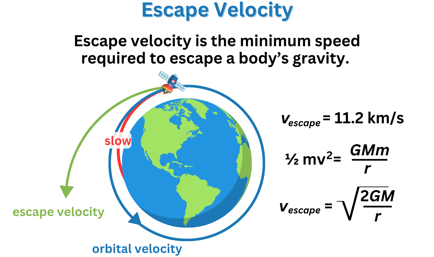 - Example for Earth: \( G M = 3.986 \times 10^{14} \, \text{m}^3/\text{s}^2 \), \( R = 6.37 \times 10^6 \, \text{m} \), giving \( v_{esc} \approx 11.2 \, \text{km/s} \).