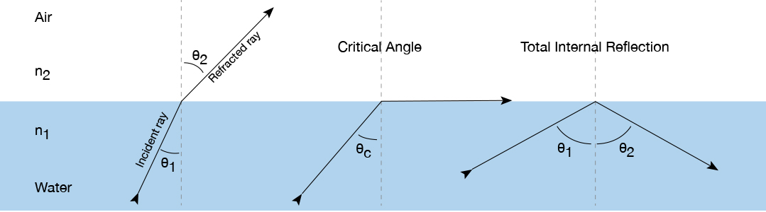 - If \(\mathrm{\theta_i > \theta_c}\), total internal reflection occurs.