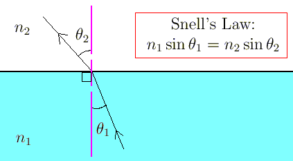 - \(\mathrm{\theta_2}\) = angle of refraction (measured from the normal)