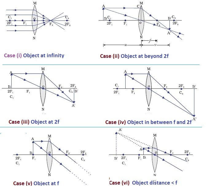 - Object at F: Rays emerge parallel, image is formed at infinity.
