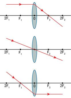 - A ray parallel to the principal axis passes through the focal point on the opposite side of the lens.