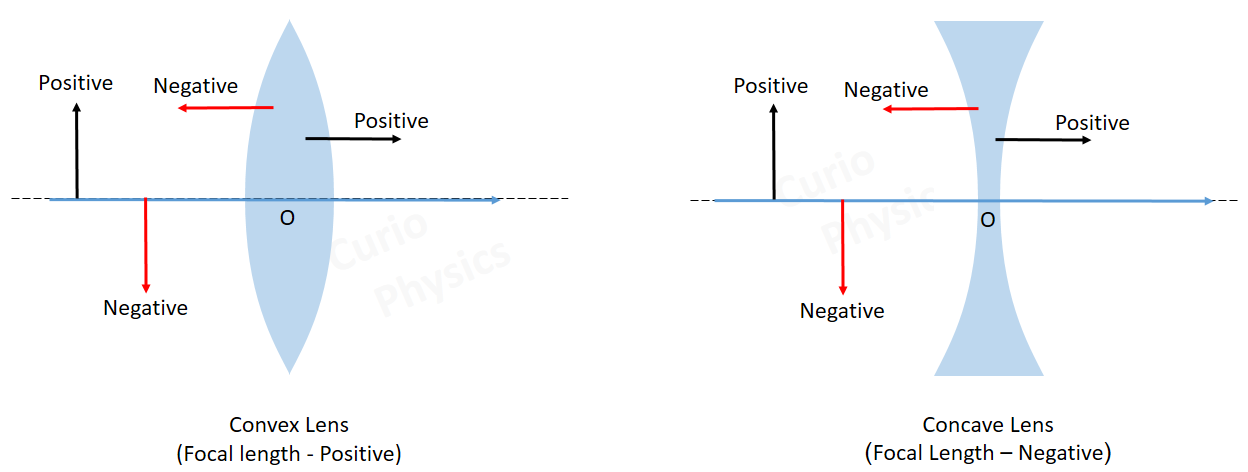 - For a convex lens, the focal length \(\mathrm{f}\) is positive.