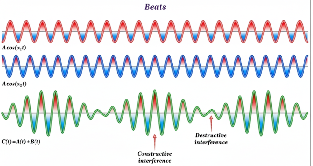 $\mathrm{f_{beat} = |f_1 – f_2|}$