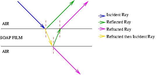 - Light is partially reflected at the top surface of the film and partially transmitted.