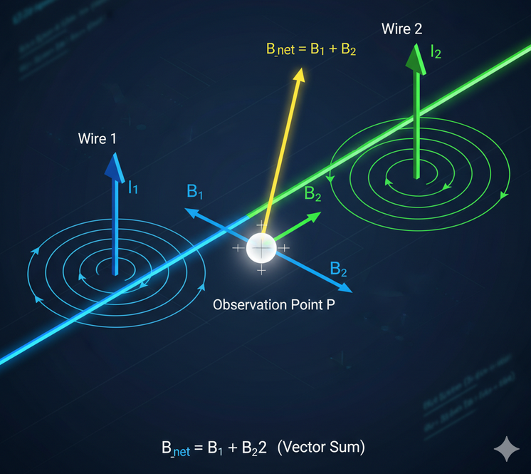 Magnetic fields are vectors; the net field at any point is the vector sum of fields from all sources.