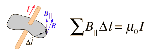 \( \mathrm{\oint \vec{B} \cdot d\vec{\ell} = \mu_0 I_{enc}} \)
