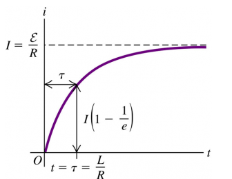 \( \mathrm{I(t) = I_{max}\big(1 – e^{-t/\tau}\big)} \), where \( \mathrm{I_{max} = \dfrac{\mathcal{E}}{R}} \).