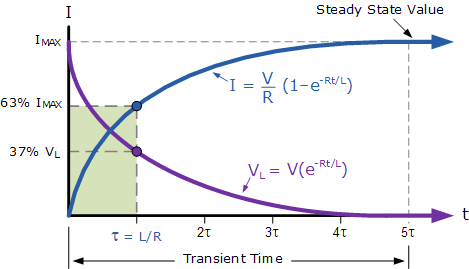 Current growth: \( \mathrm{I(t) = I_{max}(1 – e^{-t/\tau})} \).