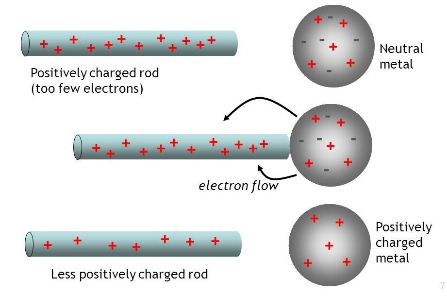 Example: A positively charged rod touches a neutral metal sphere. Electrons flow from the sphere to the rod. After separation, the sphere is left with a net positive charge.