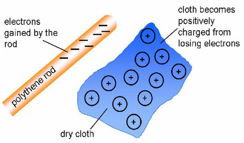 Example: Rubbing a rubber rod with fur transfers electrons from the fur to the rod. The rod becomes negatively charged, while the fur becomes positively charged.