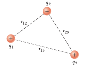 Step 1: Formula for total potential energy: \( \mathrm{U_{total} = \dfrac{1}{4 \pi \varepsilon_0} \left( \dfrac{q_1 q_2}{r} + \dfrac{q_1 q_3}{r} + \dfrac{q_2 q_3}{r} \right)} \)