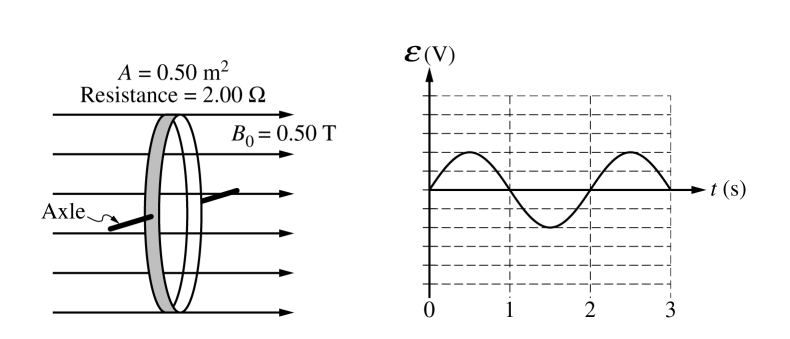 The ring is now mounted on an axle that is perpendicular to the magnetic field. The magnitude of the magnetic field is now held at a constant B0 = 0.50 T, as shown. The ring rotates about the axle, and the emf ε induced in the ring as a function of time t is shown on the graph.
