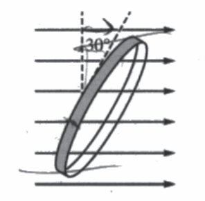 The ring is then rotated so that the plane of the ring is aligned at a 30° angle to the magnetic field, as shown. The magnitude of the magnetic field is reset to a magnitude of B0 at a new time t = 0 and again begins to decrease at t = 1 s according to the equation \(B(t)=\frac{\beta }{t}\) , where β has units of T · s.