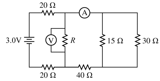 In the circuit shown above, the current through the ammeter is 20 mA and the voltmeter indicates 1.0 V. What is the current through the 40 W resistor?