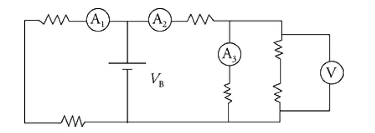 The diagram shows a circuit that contains a battery with a potential difference of VB and negligible internal resistance; five resistors of identical resistance; three ammeters A1, A2, A3; and a voltmeter.