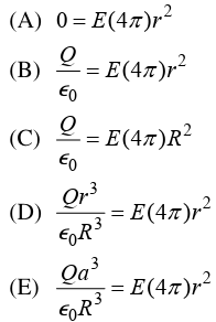 An insulated nonconducting sphere of radius R has a charge Q uniformly distributed throughout its volume. It is surrounded by a concentric spherical conducting shell of inner radius a and outer radius b, as shown in the figure above. There is no net charge on the conducting shell. Let E be the electric field magnitude at a distance r from the center of the spheres. Which of the following represents a correct application of Gauss’s law for r < R ?