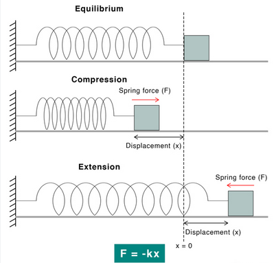 - The negative sign indicates that the spring’s force is directed opposite to the displacement — it always acts to restore the spring to equilibrium.