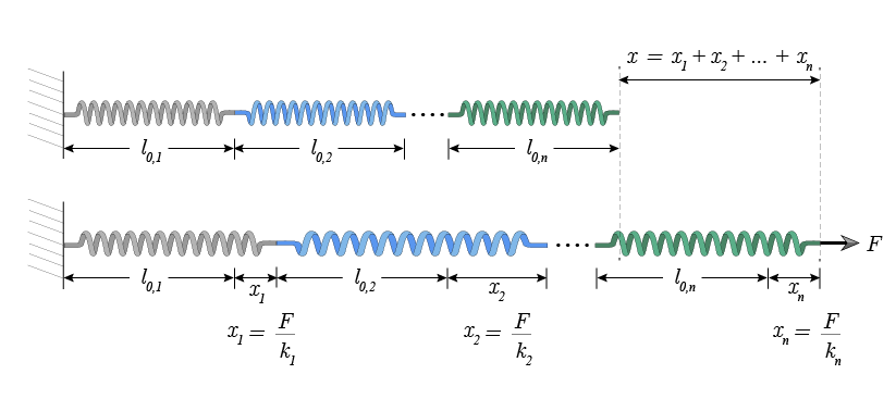 \( \mathrm{x_{total} = \dfrac{F}{k_1} + \dfrac{F}{k_2} + \dots = F \left(\dfrac{1}{k_1} + \dfrac{1}{k_2} + \dots \right)} \)