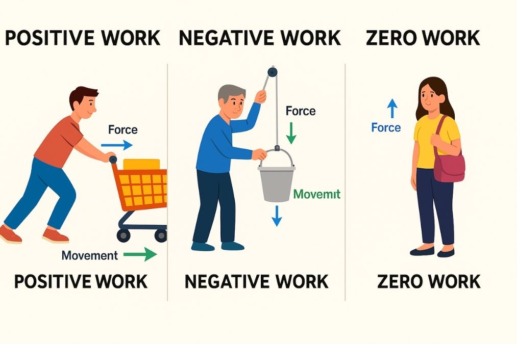 | Positive Work | \( \mathrm{0^\circ \leq \theta < 90^\circ} \) | A person pushes a box forward. | \( \mathrm{W = Fd\cos\theta > 0} \) |