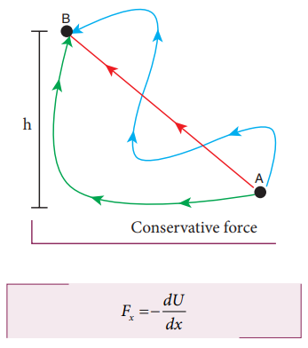 The change in potential energy between two points \( \mathrm{a} \) and \( \mathrm{b} \) is equal to the negative of the work done by the conservative force as the system moves between those points:![]()