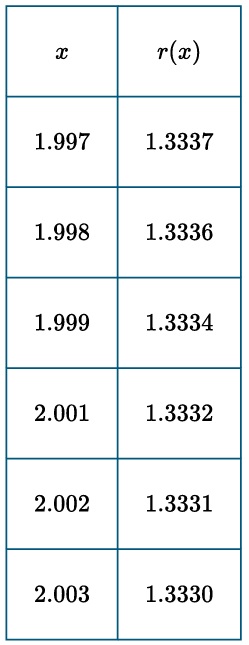 \( \lim_{x \to 2} r(x) = \frac{2+2}{2+1} = \frac{4}{3} \).