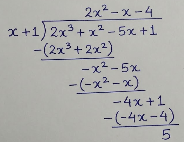 \( \mathrm{ \displaystyle f(x) = (x + 1)(2x^2 – x – 4) + 5 } \)