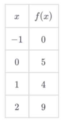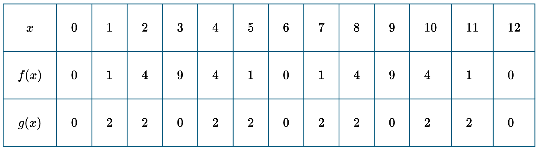 From the table, \( f \) has period 6: pattern \( 0, 1, 4, 9, 4, 1 \) repeats.