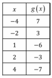 Compare the values at opposite inputs: \( g(4) = -7 \) and \( g(-4) = 7 \).