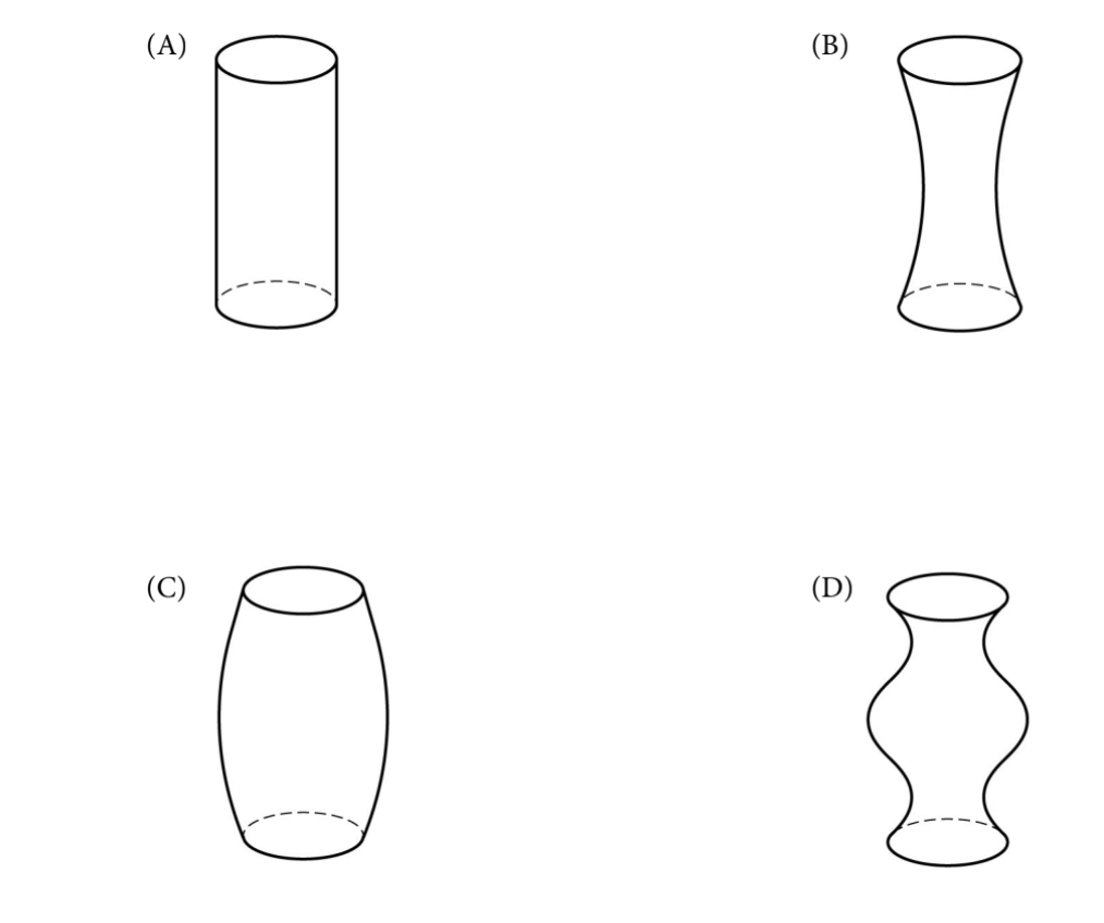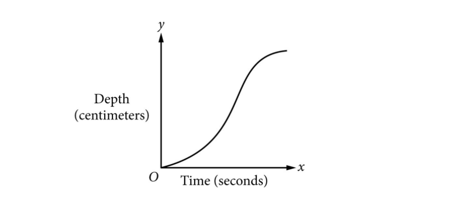 Water poured at constant rate → volume in vase increases linearly with time. Depth \( h \) vs. time \( t \) depends on horizontal cross-sectional area \( A(h) \): \[ \frac{dV}{dt} = \text{constant} \quad\text{and}\quad dV = A(h)\, dh \] so \[ \frac{dh}{dt} = \frac{\text{constant}}{A(h)}. \]