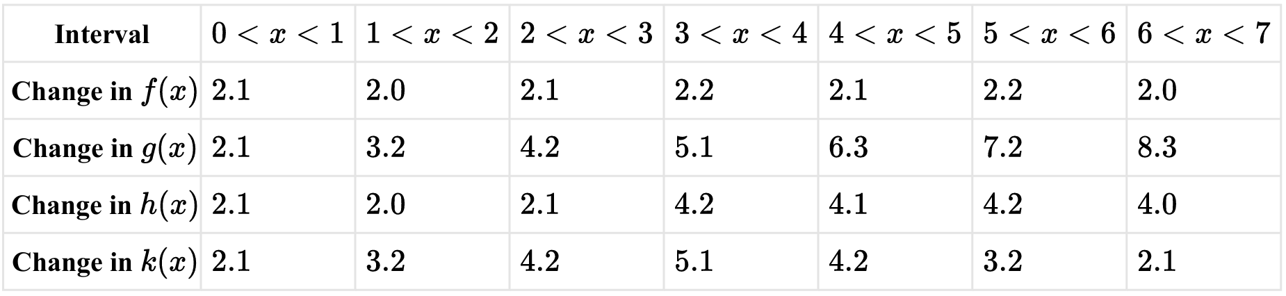 (D) \(g\) is best modeled by a quadratic function, because the change in the average rates of change over consecutive equal-length input-value intervals is constant.