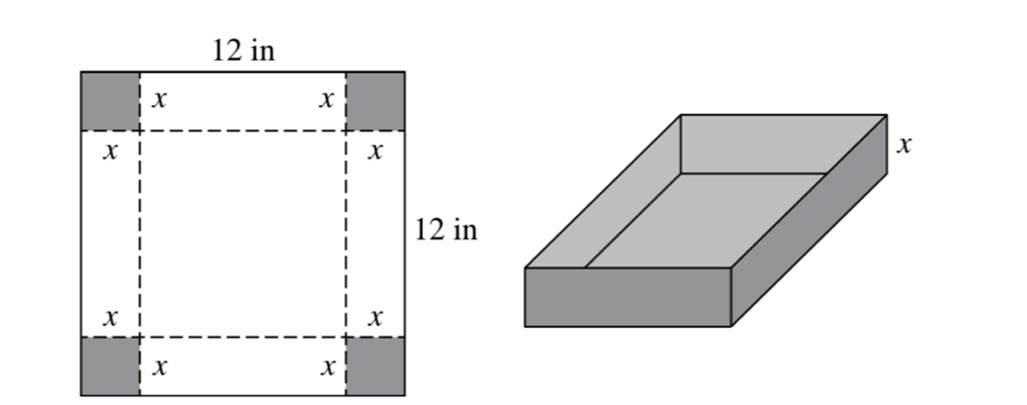 The figure shows a square sheet of cardboard on the left and an open box on the right. The square sheet has side length $12$ inches (in) and is used to make the open box by removing from each of the four corners a square of side length $x$ inches, and folding up the sides. For what value of $x$ does the box have the maximum possible volume?
