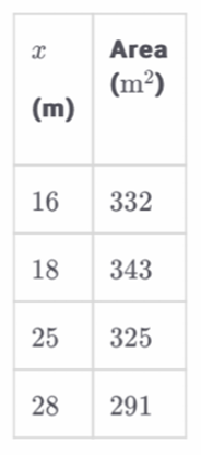 The quadratic regression for the points $(16, 332), (18, 343), (25, 325), (28, 291)$ is $A(x) = -0.932x^2 + 35.85x + -2.48$.