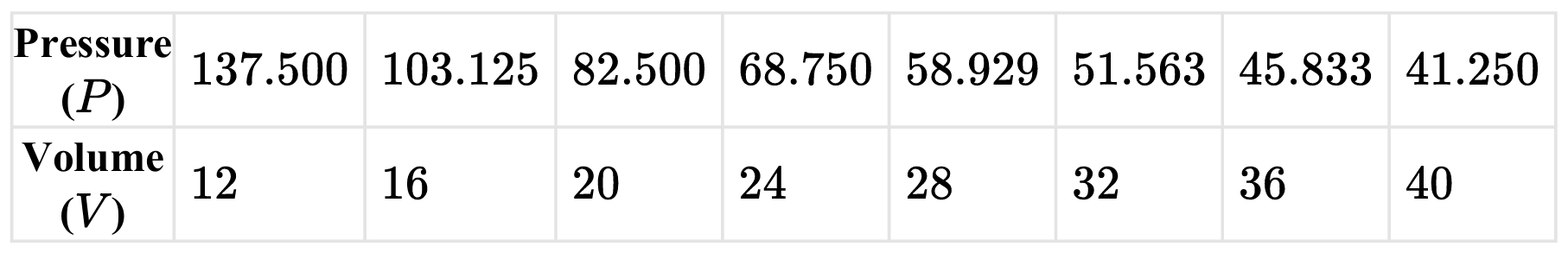 Using the first data point from the table: $P = 137.500$ and $V = 12$.