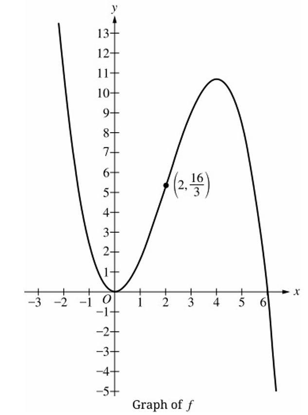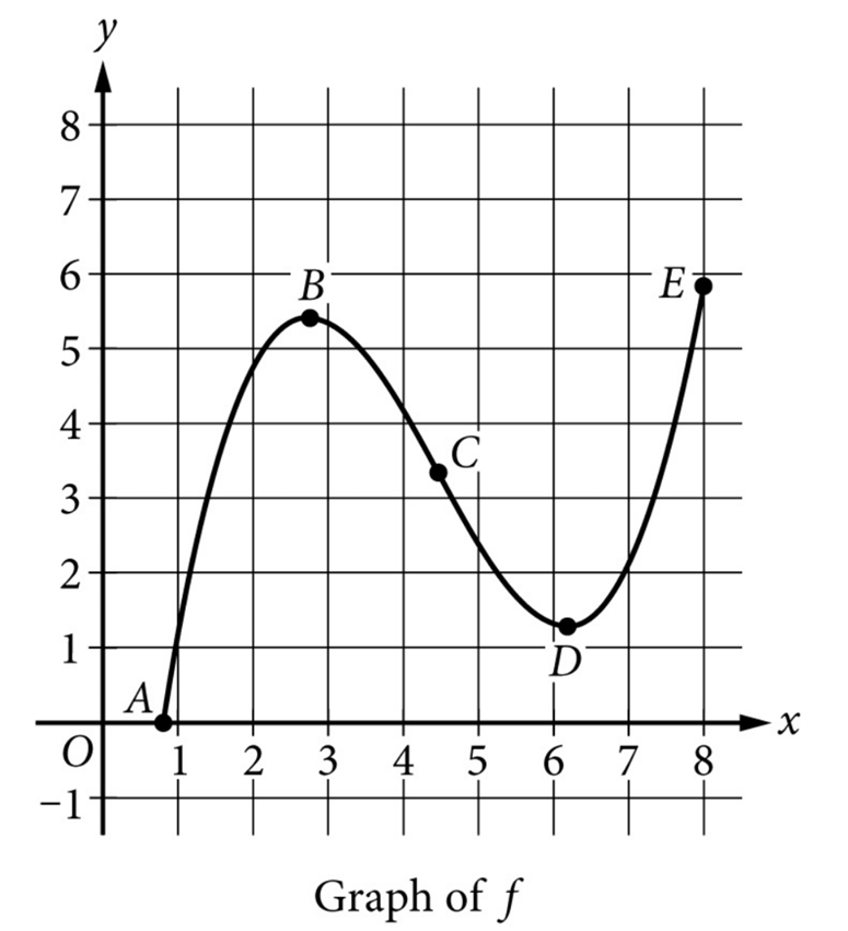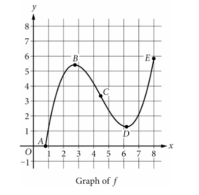 Over \( 2 < x < 6 \), from typical shapes implied by AP problems (and given answer key says D), the graph is increasing but at a decreasing rate — i.e., slopes are positive but getting smaller ⇒ concave down.