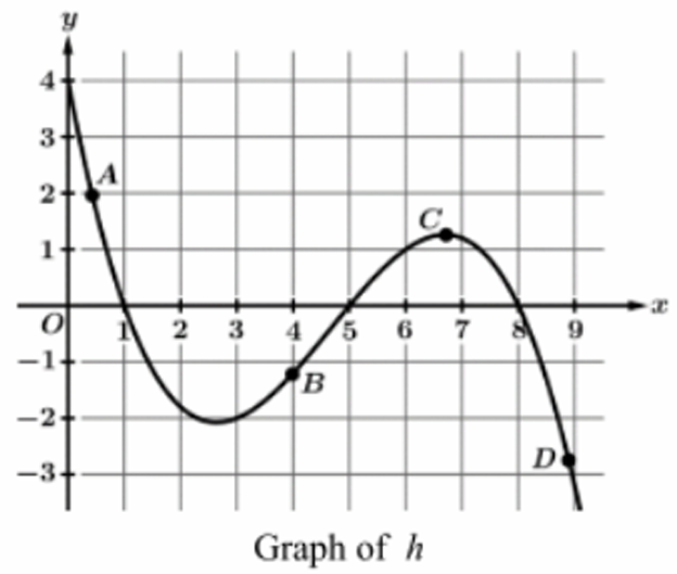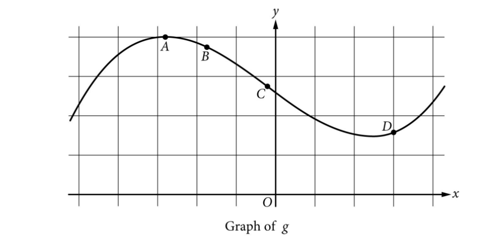 C: Inflection point where graph goes from concave down to concave up. This is where the slope is minimal (steepest negative).