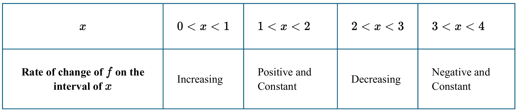 The table gives characteristics of the rates of change of the function \( f \) on different intervals. Which of the following is true about \( f \) on the interval \( 3 < x < 4 \)?