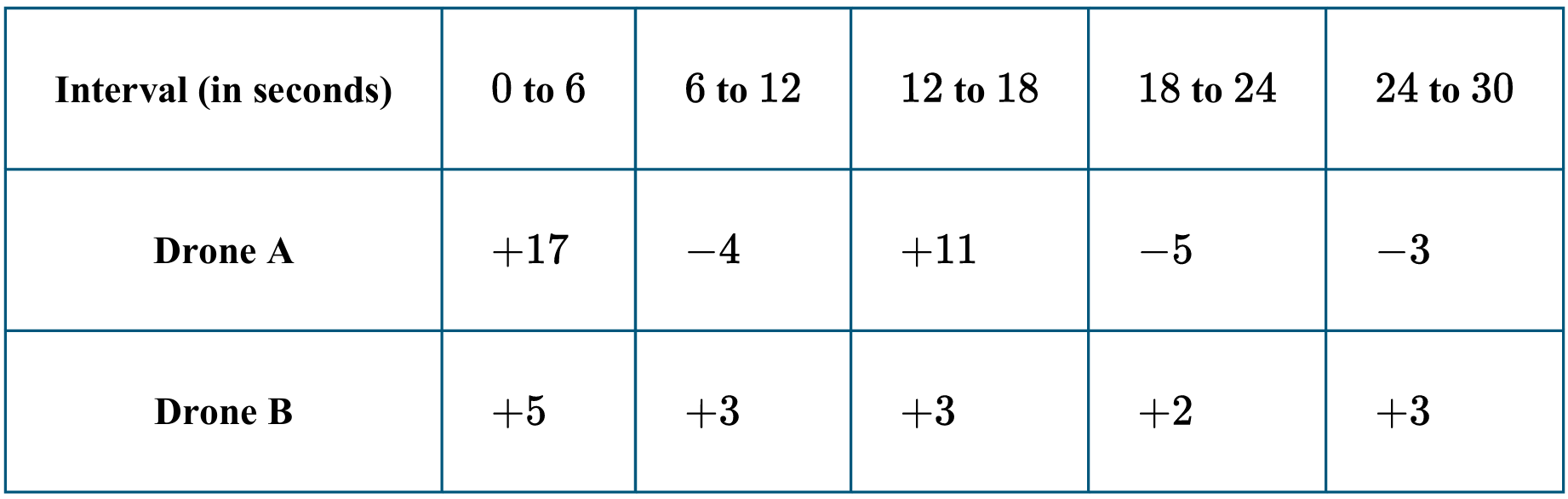 Two drones are flying over a given area, and their heights above the ground are changing. The table gives the change in height, in feet, for the drones over successive 6-second intervals. Which of the following is true about the average rates of change for drone A and drone B over the time interval from \( t = 0 \) seconds to \( t = 30 \) seconds?