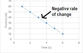 A rate of change is negative when an increase in one quantity causes the other quantity to decrease.