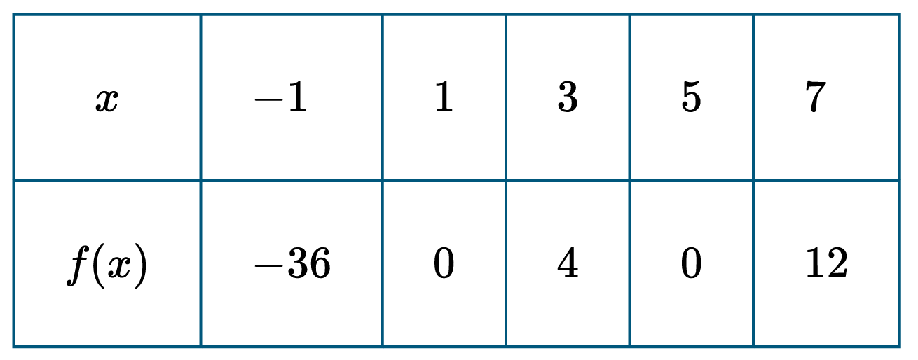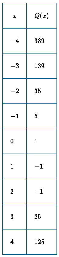 To determine the degree, compute successive finite differences since the \(x\)-values increase by \(1\). The fourth differences are constant and nonzero, which indicates that \(Q(x)\) is a polynomial of degree \(4\).