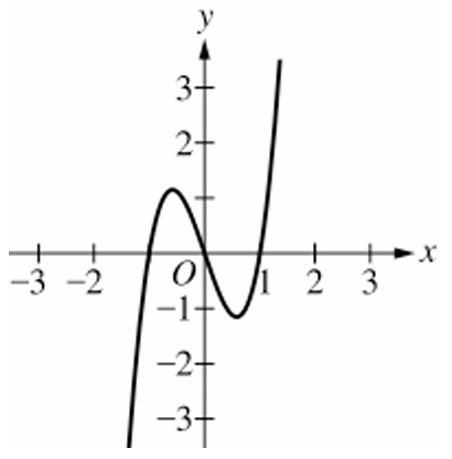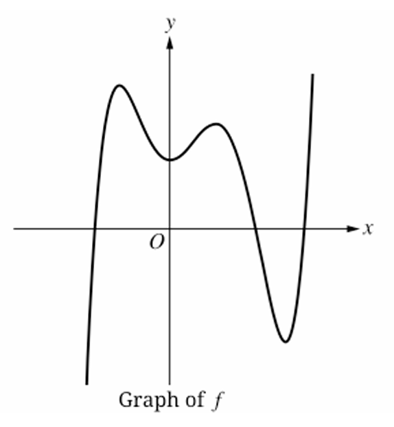 A point of inflection occurs where the concavity of \( f \) changes, that is, where \( f”(x) \) changes sign. Observing the graph from left to right: the curve changes from concave down to concave up once before the first local minimum, then from concave up to concave down before the next local maximum, and finally from concave down to concave up before the deep minimum. Thus, there are exactly \( 3 \) changes in concavity.