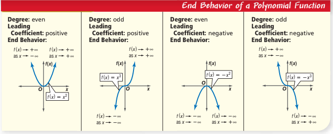 This table shows how the degree and the sign of the leading coefficient determine the end behavior of a polynomial function.