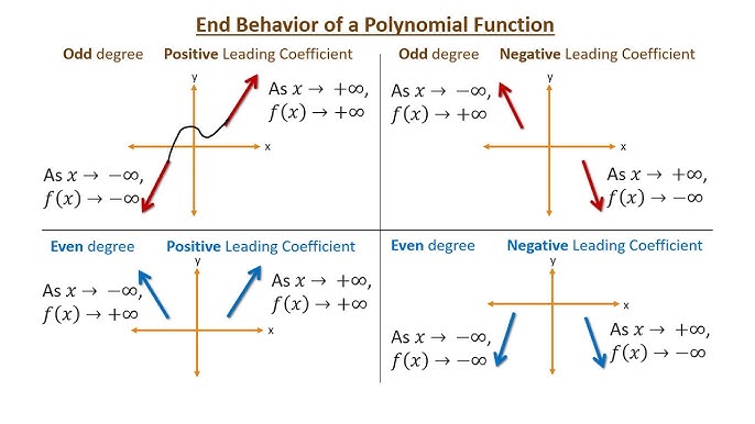 | Degree of Polynomial | Sign of Leading Coefficient | End Behavior as \( x \to -\infty \) | End Behavior as \( x \to \infty \) |