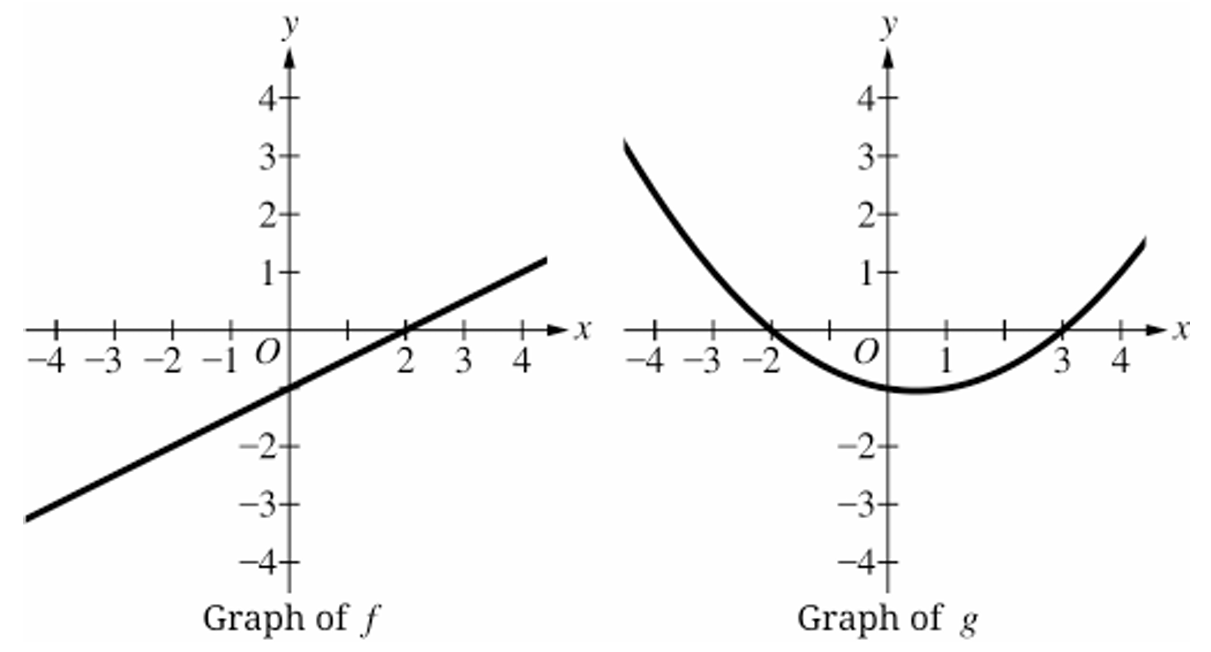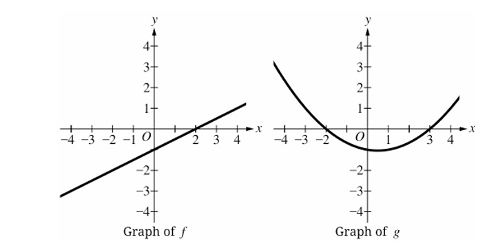 Given answer: \( x = -2 \) and \( x = 3 \) only ⇒ not \( x = 2 \), meaning \( g \) does not have a zero at \( x = 2 \) or \( f \) cancels it.