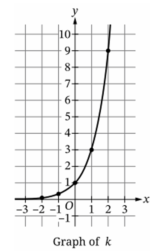 The graph of \(k\) clearly passes through \((1, 3)\) and \((2, 9)\).